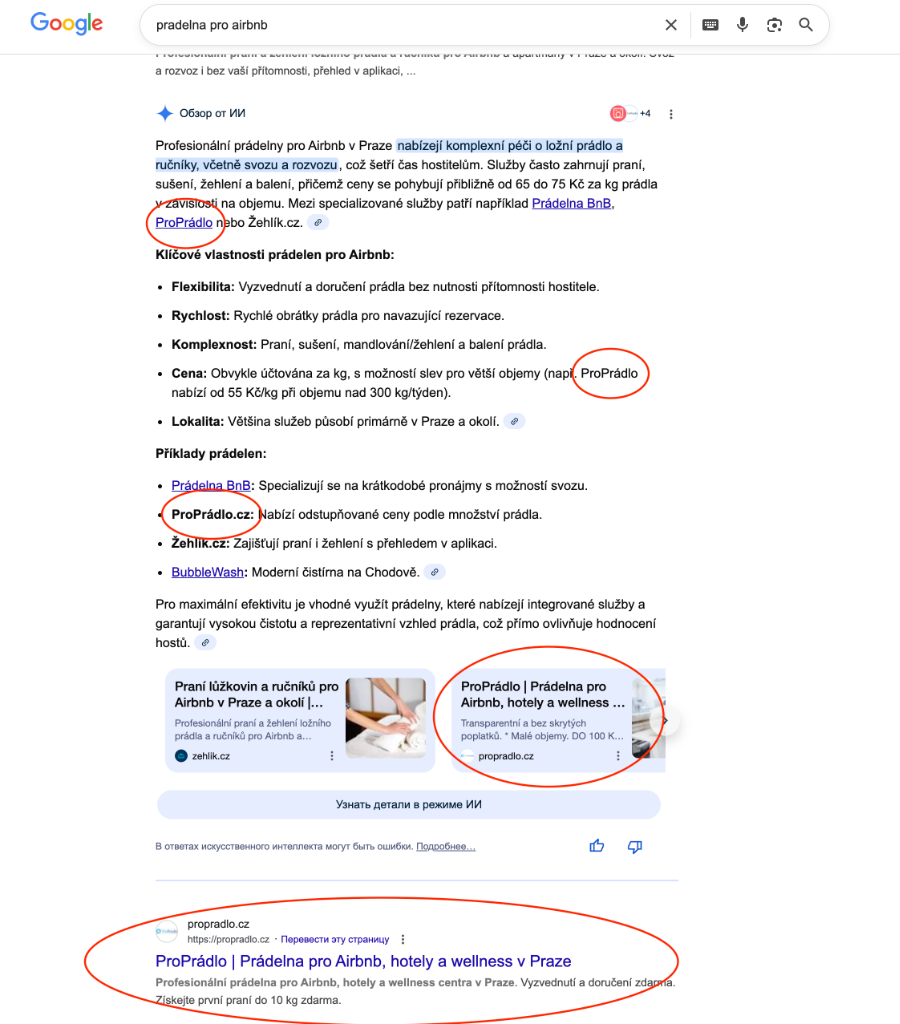 Благодаря оптимизации контента и структуры, компания ProPradlo не только заняла ТОП-3 в органической выдаче Google, но и стала основным рекомендательным ответом в AI Overview (Generative Search).